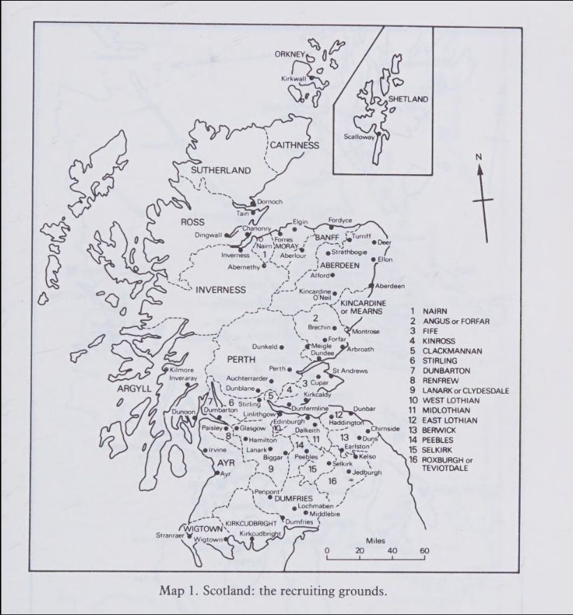 In short, the Campbells were in charge of mustering troops from an area of Scotland known as Argyll. Here’s a map of the recruiting grounds that I found in a fantastic book called A Regimental History of the Covenanting Armies 1639-1651 by Edward M Furgol. (This is one of the main sources SPOWS uses for their own research into the Dunbar and Worcester prisoners). If you want some “light reading” you can read it for free here